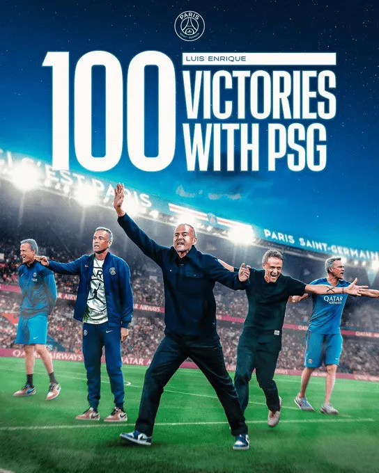 据统计,本场比赛是恩里克带队夺得的第100场胜利。对此,巴黎官方发布海报祝贺,并配文:“我们主帅路易斯-恩里克执教巴黎圣日耳曼的第100场胜利。”