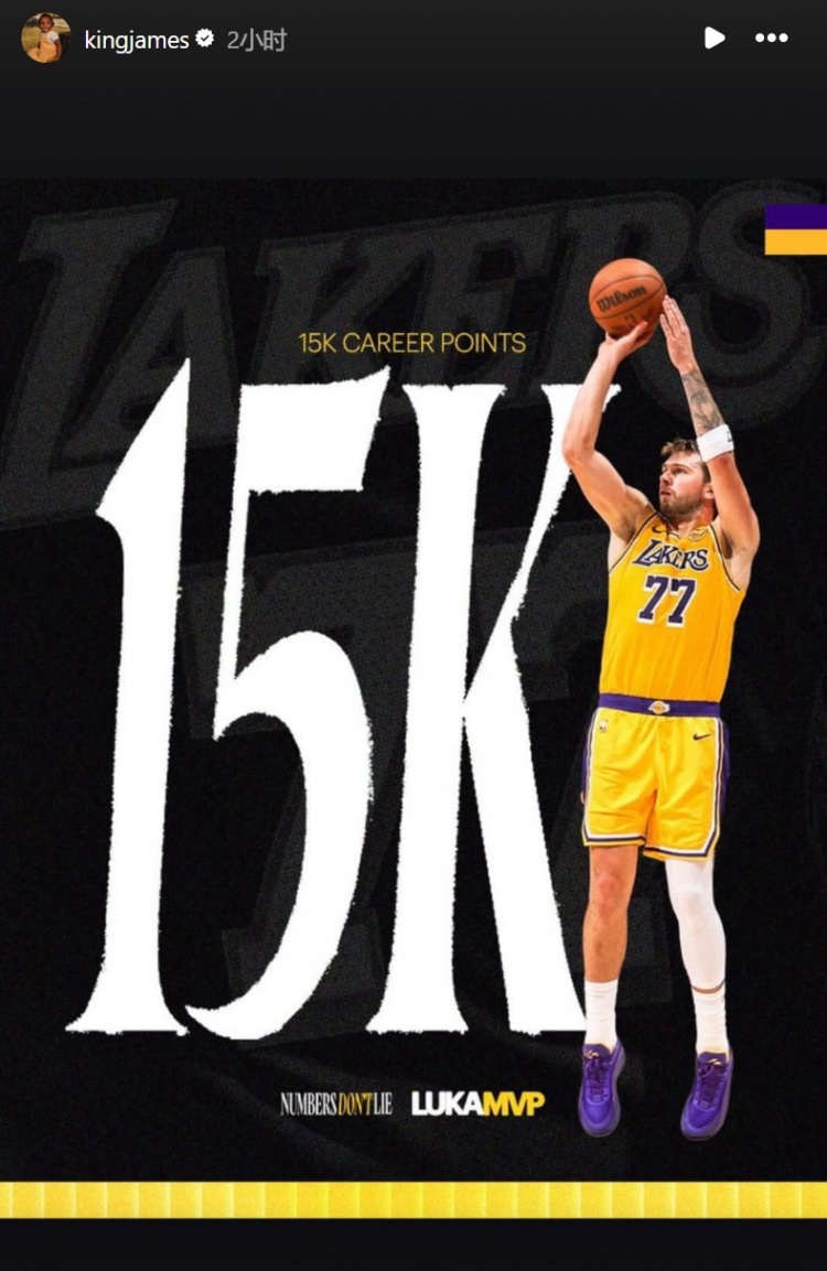 4月1日讯 NBA常规赛,湖人主场127-113战胜骑士。在本场比赛中,湖人多人达成里程碑,东契奇解锁生涯15000分;八村塁生涯得分突破5000分;雷迪克执教生涯获得100场胜利。赛后,詹姆斯转发以上报道送上祝贺。此役,詹姆斯出战31分钟,8中4,三分3中1,罚球6中5拿到14分5篮板6助攻1抢断1盖帽,正负值+4。...